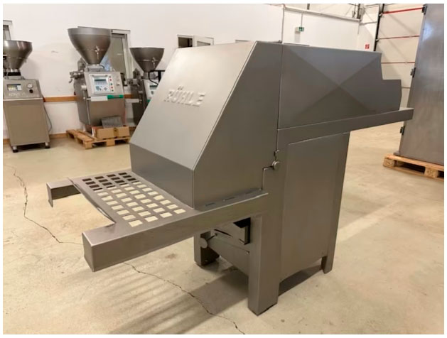 Cortadora de carne congelada del fabricante Rühle, modelo GFR 450 en muy buen estado de uso y funcional. La máquina es del año 2016, opera a 400 Voltios, 7,2 kW, completamente de acero inoxidable, guillotina hasta -18 °C, tamaño máximo del producto a cortar 400 x 200 mm, en buen estado, revisada en taller, lista para usar de inmediato, dimensiones 60/230/140 cm.