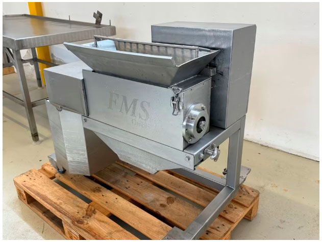 Cortadora/trituradora de carne congelada del fabricante FMS GmbH, en muy buen estado de uso y funcionamiento. La máquina funciona con 400 voltios, está fabricada íntegramente en acero inoxidable, es móvil, tiene una abertura de 38 cm de ancho y es apta para picar carne congelada. Ha sido probada en taller y mide 70 cm x 95 cm x 90 cm.